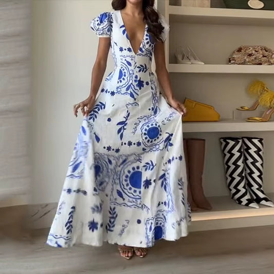 Ellafads™ Summer Glam Maxi Dress – Printed Deep V-Neck, Puff Sleeves, Waist-Slimming Fit for Beach to Party Chic